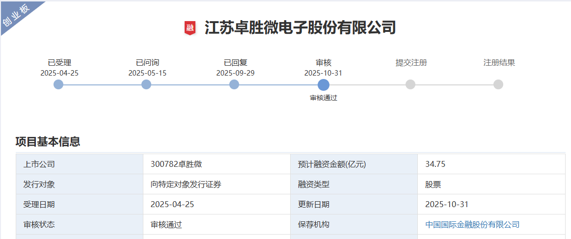 卓胜微不超34.75亿定增获深交所通过 中金公司建功
