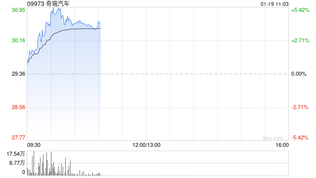 奇瑞汽车盘中涨超5% 灵犀智舱计划于2026年一季度实现全品牌全系主力车型全面上车