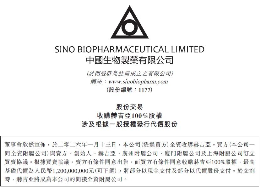 收购交易概览 - 中国生物制药于1月13日宣布,全资收购专注于小干扰核酸(siRNA)创新药研发的先锋生物医药企业赫吉亚[1][10] - 根据买卖协议,收购赫吉亚100%股权的最高基础代价为人民币12亿元,该代价可下调,支付方式为部分现金、部分代价股份[3][10] - 交易完成后,赫吉亚将成为中国生物制药的间接全资附属公司[3][10] 被收购方(赫吉亚)业务与技术 - 赫吉亚已构建从靶点发现到临床概念验证(POC)的一体化创新药物开发体系,重点布局减重代谢、心脑血管、神经系统三大慢性病领域[3][10] - 公司成功攻克了针对肝脏、神经、肺部、肾脏、脂肪等多组织的递送技术瓶颈,实现精准靶向,其单次给药即可长效沉默靶基因的疗效、长效性及安全性已获临床前及临床试验验证[3][11] - 公司拥有自主知识产权的差异化递送平台,其核心平台MVIP是全球首个经临床验证、可实现“一年一针”超长效给药的肝靶向配送平台[4][11] - 公司DDP技术攻克了双靶点疗效协同的行业难题,可应用于多种组织[4][12] - 公司NSDP神经靶向递送平台有望实现针对中枢神经的“一年一针”给药频率[4][12] - 公司抗体-寡核苷酸偶联物(AOC)技术布局也在加速推进[4][12] 行业背景与收购战略意义 - siRNA领域2025年全球披露交易总额预计将超过350亿美元,同比增长率超过40%[3][11] - 通过此次收购,中国生物制药旨在构建下一代心血管治疗创新产品线,完善减重代谢领域布局,拓展万亿级慢性病管理市场[3][11] - 收购将发挥赫吉亚在序列设计筛选、递送系统和化学修饰方面的优势,与中国生物制药在分子形态、专利布局及临床转化方面的经验形成深度互补与协同增效[8][14] 交易股权结构 - 赫吉亚共有16名卖方股东,交易对应100%股权,基础代价总额为人民币12亿元[6][14] - 主要股东包括:创始股东一(持股16.50%,对价约1.749亿元)、国投(广东)科技成果转化创业投资基金(持股15.05%,对价约2.082亿元)、创始股东二(持股13.43%,对价约1.424亿元)、XY Hong Kong Limited(持股9.63%,对价约1.201亿元)等[6][14]