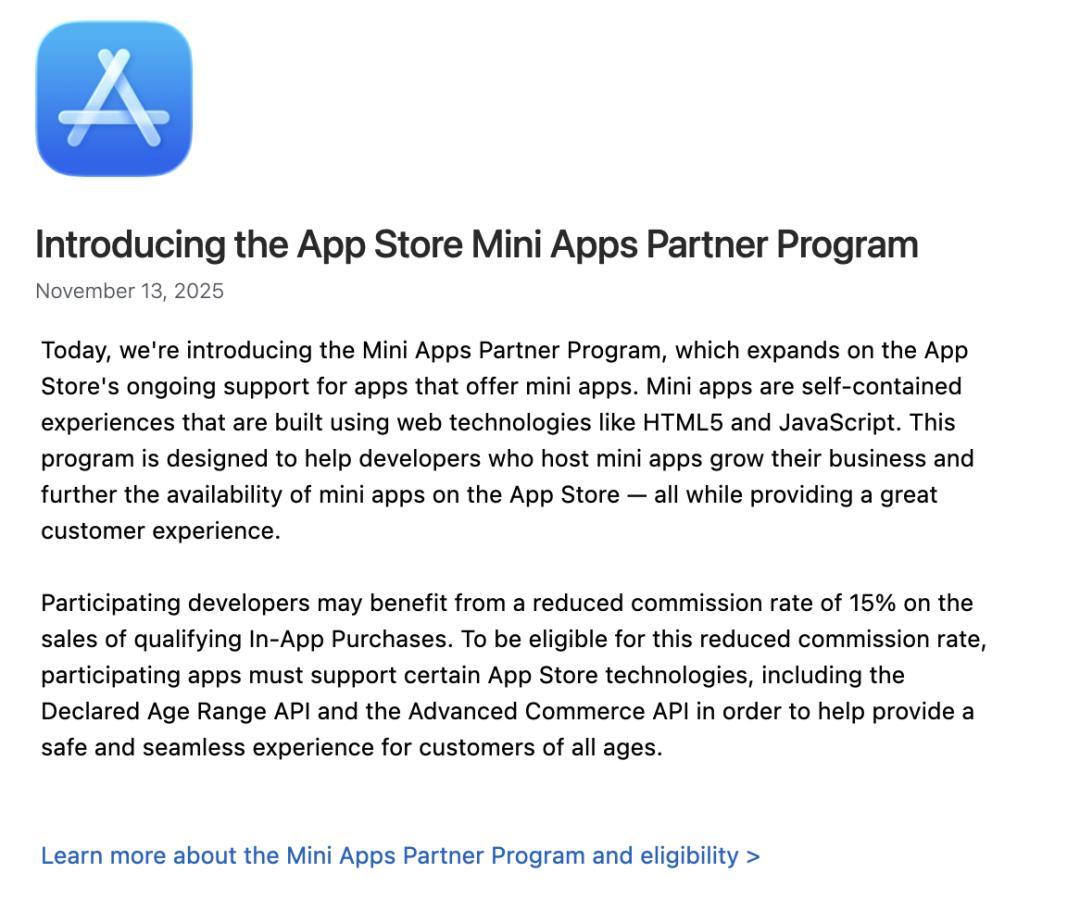 苹果小程序合作伙伴计划核心内容 - 苹果正式发布小程序合作伙伴计划,为小程序建立制度化的合规框架,使其在iOS上从灰色地带变为被承认、被规范、被商业化的应用形态[1][9] - 小程序被定义为基于Web技术构建的自包含体验,分发在宿主App内,用户无需安装即可访问内容、服务或小游戏[8] - 该计划在中国得以推行,与腾讯和苹果达成的协议关系巨大,苹果将可以从微信小程序和小游戏中抽成15%[3] 计划具体规则与技术基础 - 小程序必须使用苹果的高级商务API,支付必须走苹果官方通道,商品目录必须透明,购买记录必须可追踪[17] - 宿主App必须支持声明年龄范围API,允许在一个年龄分级的App内托管不同年龄层级的小程序内容[17] - 宿主App必须同时提供iOS与iPadOS版本,保证用户在不同设备上体验的一致性[17] 商业模式与抽成变化 - 当宿主App满足所有要求加入计划后,小程序数字商品收入的抽成直接降至15%,相比传统App内购30%的抽成腰斩[21][25] - 此举将为轻量应用和服务提供更具吸引力的商业化路径,特别是对过去在iOS上几乎无商业化空间的HTML5游戏团队[31] 苹果推行计划的动因分析 - 监管压力是现实动因,欧盟DMA要求平台开放,小程序是一种“可控的开放”,在不失去生态控制权的前提下提供更灵活的应用形态[26] - 全球超级App向平台化演变是行业动因,苹果选择将规则写清楚并纳入自身监管体系,而非阻挡趋势[26] - AI是长远动因,小程序可能成为未来“意图层”和“功能层”之间的桥梁,为AI时代的交互方式预留空间[28][30] 对行业潜在影响 - Web技术在移动端被重新推回舞台,轻量工具、便民服务、小型功能闭环、休闲H5游戏将迎来新的分发路径[31] - 国内轻游戏团队可能在全球市场重新获得机会[31] - 微信小程序的国际化出现新的可能,微信国际版若接入计划,可在苹果框架下托管小程序并使用苹果支付结算[33] - 苹果意在构建新的“生态层级”,原生App是厚重能力层,Mini App是轻量可分发的第二层,最上层是AI调度[34]