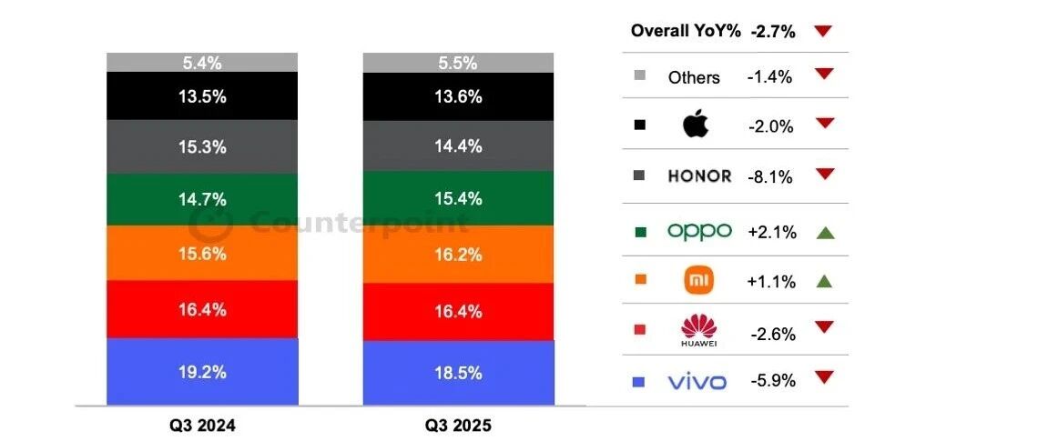 2025 年 Q3 中国智能手机销量同比下滑 2.7%;在 iPhone 17 需求推动下 Q4 销量增长势头向好