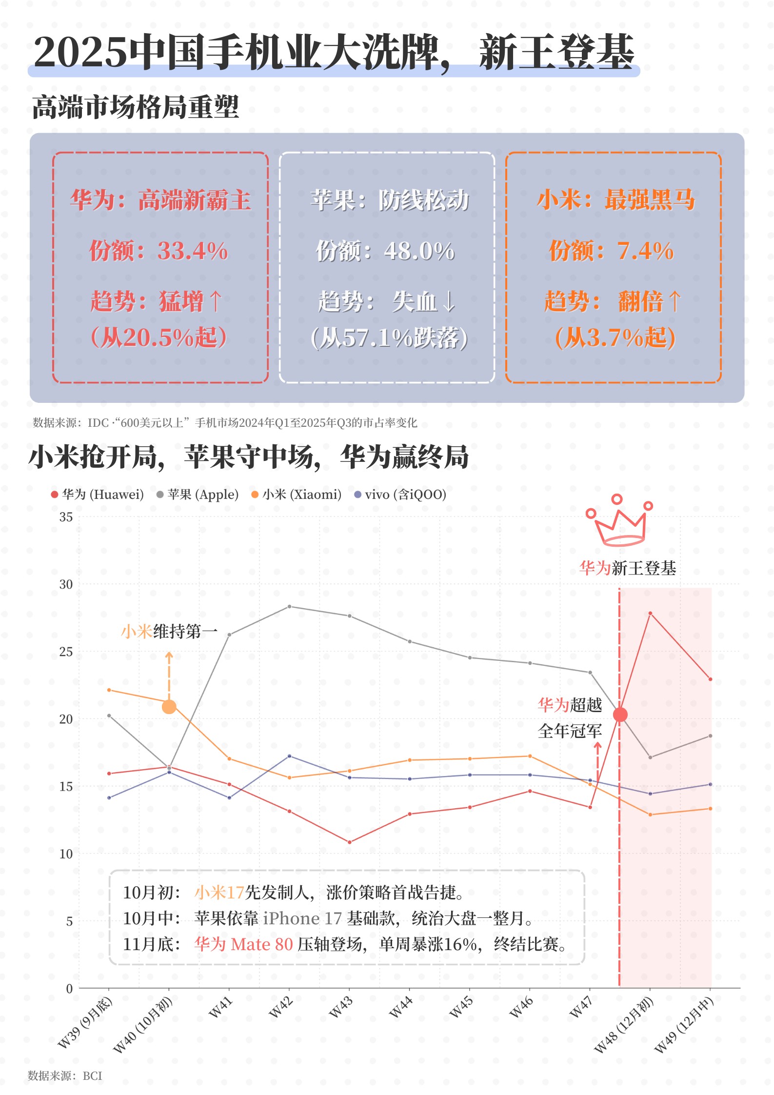 作者|邱晓芬 2025年,手机圈在成本飙升的"超级周期"中迎来残酷洗牌。当零部件成本普涨10%-25%,市场被一道600美金的红线切开:中低端陷入存量塌陷,唯有高端 市场凭借AI与生态逆势扩张。 "透视图"栏目在年终特别策划了"36氪年度总结"系列,用数据透视2025全年趋势,以图片呈现今年商业世界中不可错过的要点。 36氪制图 苹果:不装了,基础款也给"全家桶" 面对国产追击,苹果不再矜持。iPhone 17基础款不再"挤牙膏",破天荒补齐高刷等核心短板,销量在中国近乎翻番,成为统治10月的绝对主力。哪怕AI迟 到,苹果仍凭基础款的"降维打击"守住了高端大盘。 小米:敢用高端换未来 10 5 - 3.7% 0 2024 Q1 2024 Q2 2024 Q3 2024 Q4 2025 Q1 vivo: 成也中端,危也中端 10 5 2.7% 0 2024 Q2 2024 Q3 2024 Q1 2024 Q4 2025 Q1 数据来源:IDC · "600美元以上"手机市场2024年Q1至2025年Q3的市占率变化 高端将是唯一增长的市场 2026年, 数据来源:IDC 36氪制图 华为:硬刚五年,终夺王位 靠 ...