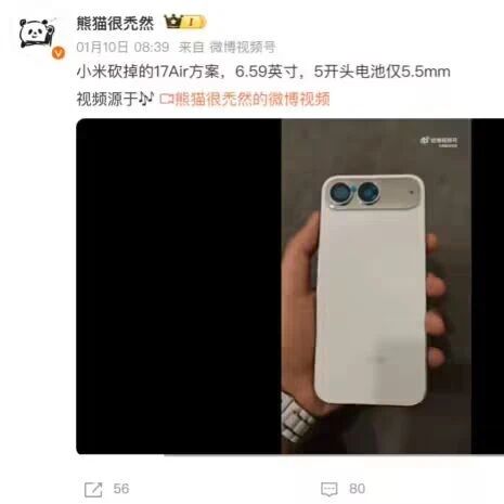文章核心观点 - 网络博主爆料小米公司一款代号为“小米17 Air”的超薄旗舰工程机已被砍掉 该机型在设计与配置上完全对标苹果iPhone Air 但公司内部研判认为超薄机没有市场 最终决定放弃该项目 [1][2][3][4] 产品设计与定位 - 被砍掉的工程机整体风格类似苹果iPhone Air 背面采用横向双摄设计 中框使用抛光工艺 [1] - 该工程机完全对标苹果iPhone Air 定位为超薄旗舰机型 [2][3] - 行业观察指出 荣耀即将推出的Magic 8 Pro Air可能是前五大厂商中唯一真正意义的超薄旗舰 其市场表现有待观察 [3] 产品硬件配置 - 工程机配备6.59英寸面板 [1][2] - 手机厚度为5.5mm或5.xmm级别 [1][3] - 电池容量为“5开头” 即5000mAh级别 或“不到6K”即6000mAh [1][3] - 手机重量为16xg(即160多克) [3] - 后置摄像头为2亿像素双摄 [3] - 搭载高通骁龙8 Elite Gen 5处理器 [3] - 外围配置包括eSIM和超声波指纹 [3] 项目状态与行业动态 - 该工程机完成度很高 但已被公司内部砍掉 主要原因是内部研判认为超薄机型没有市场 [3] - 近期互联网有相关工程机外壳流出 进一步佐证了该项目的存在 [3][4]