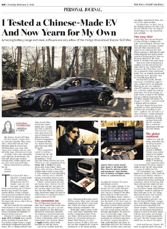文章核心观点 - 《华尔街日报》科技专栏作家Joanna Stern在美国新泽西对小米SU7 Max进行了为期两周的试驾,并给予高度评价,盛赞其驾驶体验和生态 [1][6] - 试驾者认为小米SU7 Max符合市场对科技公司造车的期待,而非传统汽车公司做科技 [1][7] - 福特公司首席执行官吉姆·法利在试驾小米SU7后也表示非常喜爱,称不想与这辆车分开 [1][7] 产品评价与市场反响 - 试驾者对小米SU7 Max的电池续航和流畅设计表示赞赏 [9] - 试驾者不仅喜爱这款车,更享受驾驶它的过程 [12] - 该电动汽车的全球售价可能在20万美元左右,但面临100%关税的影响 [12]