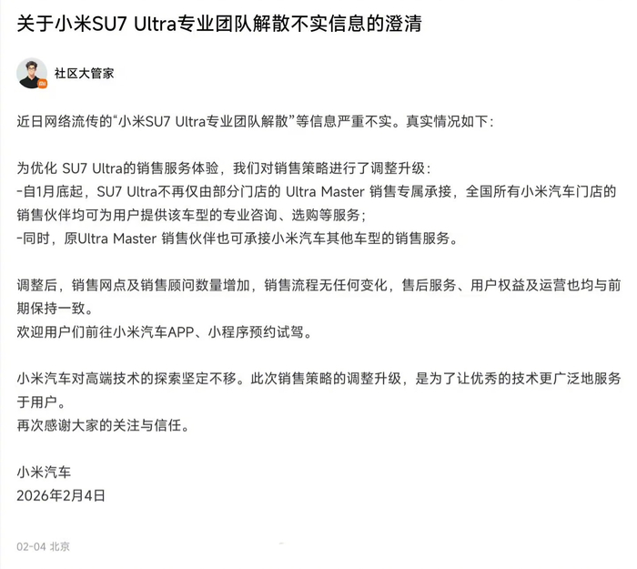 事件澄清与官方声明 - 小米汽车官方“社区大管家”发布澄清,称网络流传的“小米 SU7 Ultra 专业团队解散”信息严重不实 [1][4] - 官方表示此次为销售策略的调整升级,旨在优化 SU7 Ultra 的销售服务体验 [1][4] 销售策略调整的具体内容 - 自1月底起,SU7 Ultra 不再仅由部分门店的 Ultra Master 专属销售,全国所有小米汽车门店的销售伙伴均可提供该车型的专业咨询与选购服务 [1][4] - 原 Ultra Master 销售伙伴也可承接小米汽车其他车型的销售服务 [1][4] - 调整后销售网点及销售顾问数量增加,但销售流程无任何变化 [1][4] - 售后服务、用户权益及运营均与前期保持一致 [1][4] 市场传闻与舆论反应 - 此前有多名小米汽车销售及门店人员在社交平台透露,SU7 Ultra 专属销售团队“UltraMaster”已于1月底正式解散 [2][6] - 调整后,所有门店初级销售及主管均可销售该车型,普通销售已能正常接待客户并完成交易 [2][6] - 2月4日午间,相关话题“小米不再单独设立SU7Ultra专属销售”登上微博热搜,引发网友热议 [3][6]