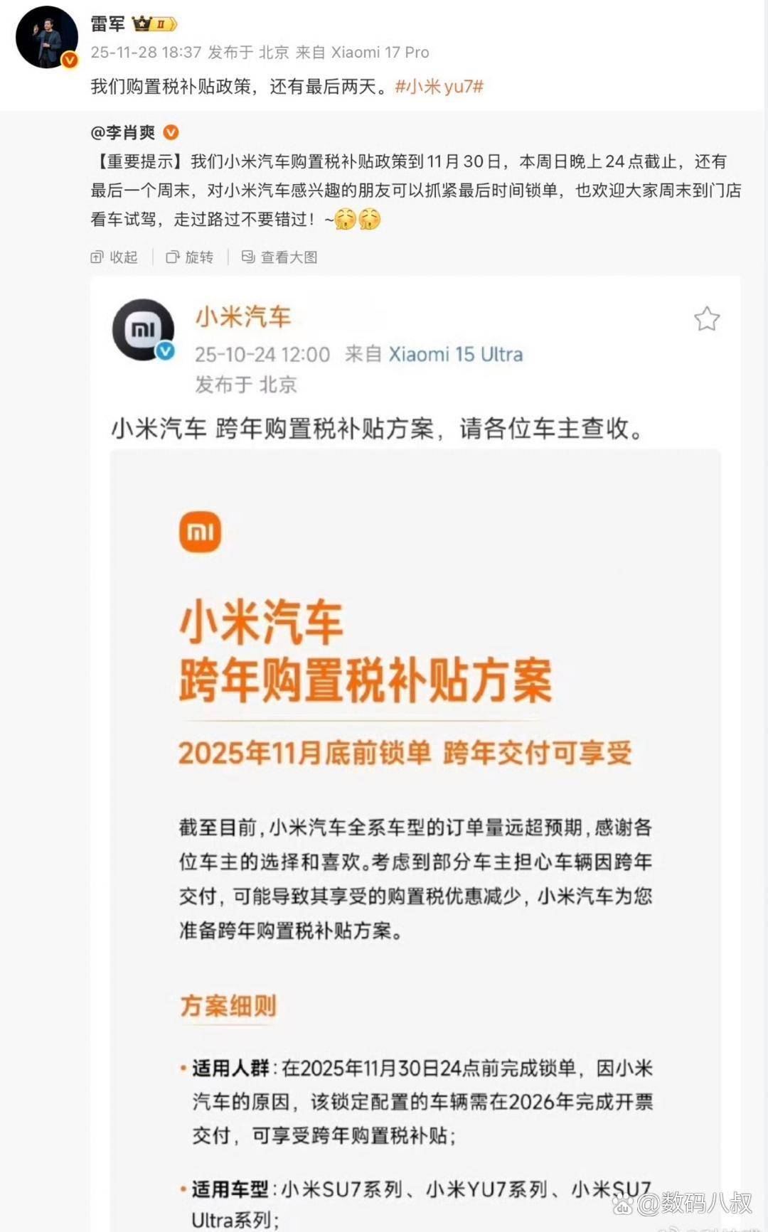 公司促销政策 - 公司发布关于小米汽车购置税补贴的重要提示,提醒消费者注意规则以避免损失[1] - 补贴政策规定,在2025年11月30日24点前完成锁单,且因公司原因需在2026年完成开票交付的车辆,可享受跨年购置税补贴[1][5] - 该购置税补贴的最高金额不超过1.5万元[1] 政策适用条件 - 政策适用人群为在2025年11月30日24点前完成锁单,且车辆交付延迟至2026年的消费者[5] - 政策适用车型包括小米SU7系列、小米YU7系列和小米SU Ultra系列[5] - 若未在截止日期前锁单,则2026年交付的车辆将无法享受此项购置税补贴[1]