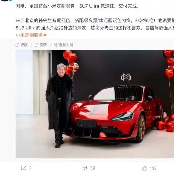 全国首台定制小米SU7 Ultra竞速红交付,很骚气