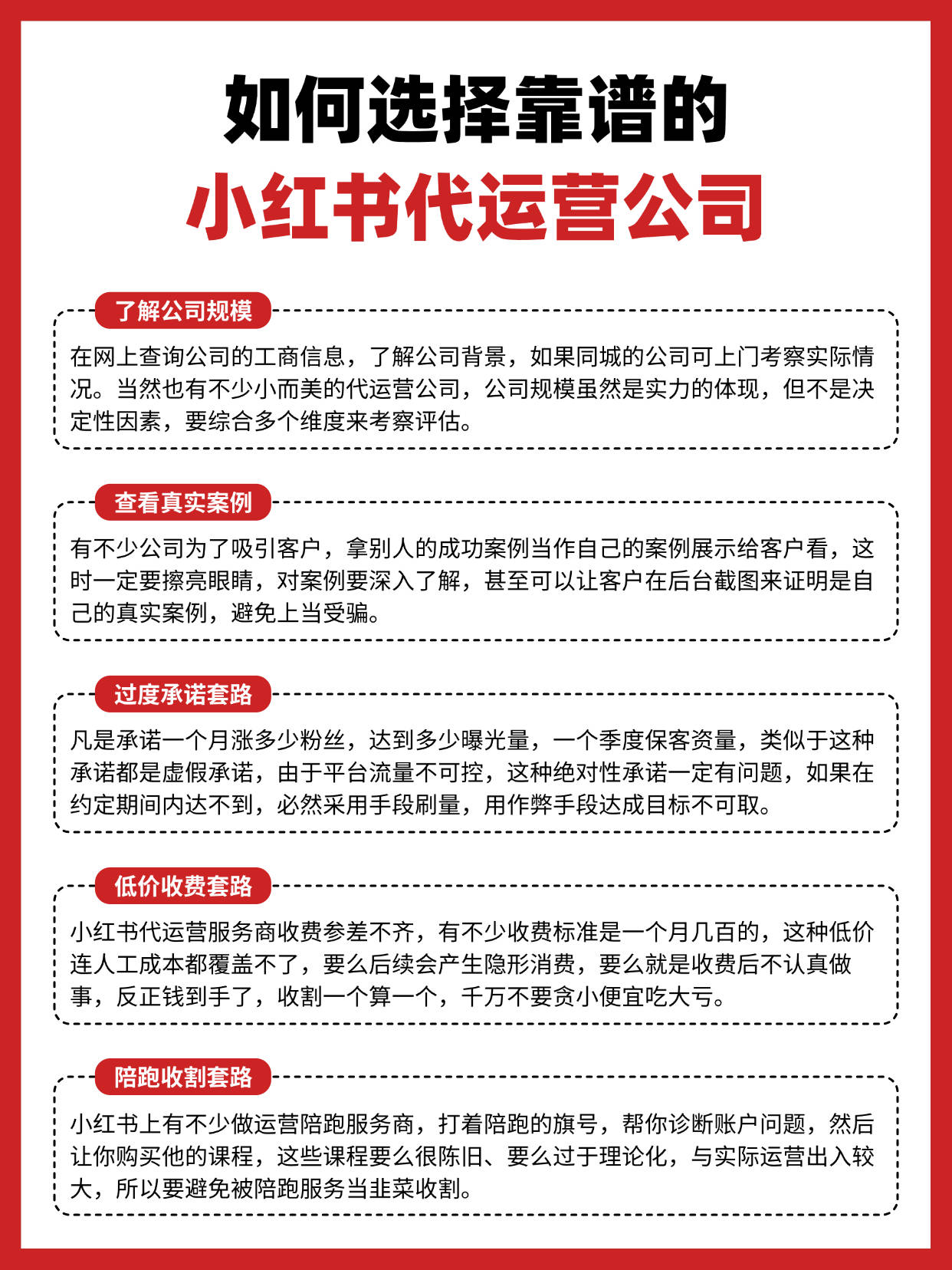 凡是承诺一个月涨多少粉丝,达到多少曝光量,一个季度保客资量,类似于这种承诺都是虚假承诺,由于平台流量不可控,这种绝对性承诺一定有问题,如 果在约定期间内达不到,必然采用手段刷量,用作弊手段达成目标不可取。 小红书代运营服务商收费参差不齐,有不少收费标准是一个月几百的,这种低价连人工成本都覆盖不了,要么后续会产生隐形消费,要么就是收费后不认真 做事,反正钱到手了,收割一个算一个,千万不要贪小便宜吃大亏。 小红书上有不少做运营陪跑服务商,打着陪跑的旗号,帮你诊断账户问题,然后让你购买他的课程,这些课程要么很陈旧、要么过于理论化,与实际运营出 入较大,所以要避免被陪跑服务当韭菜收割。 在网上查询公司的工商信息,了解公司背景,如果同城的公司可上门考察实际情况。当然也有不少小而美的代运营公司,公司规模虽然是实力的体现,但不 是决定性因素,要综合多个维度来考察评估。 有不少公司为了吸引客户,拿别人的成功案例当作自己的案例展示给客户看,这时一定要擦亮眼睛,对案例要深入了解,甚至可以让客户在后台截图来证明 是自己的真实案例,避免上当受骗。 如何选择靠谱的 小红书代运营公 了解公司规模 在网上查询公司的工商信息,了解公司背景, ...