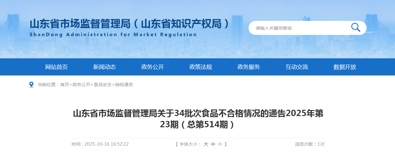 山东省市场监督管理局关于34批次食品不合格情况的通告(2025年第23期)
