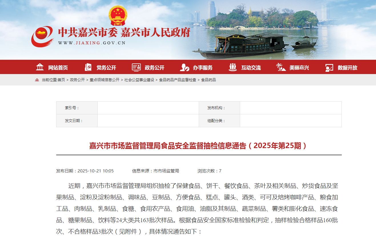浙江省嘉兴市市场监督管理局食品安全监督抽检信息通告(2025年第25期)