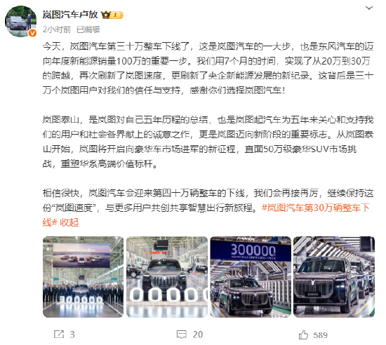 卢放官宣岚图汽车第三十万整车下线:将开启向豪华车市场进军新征程,直面50万级豪华SUV市场挑战