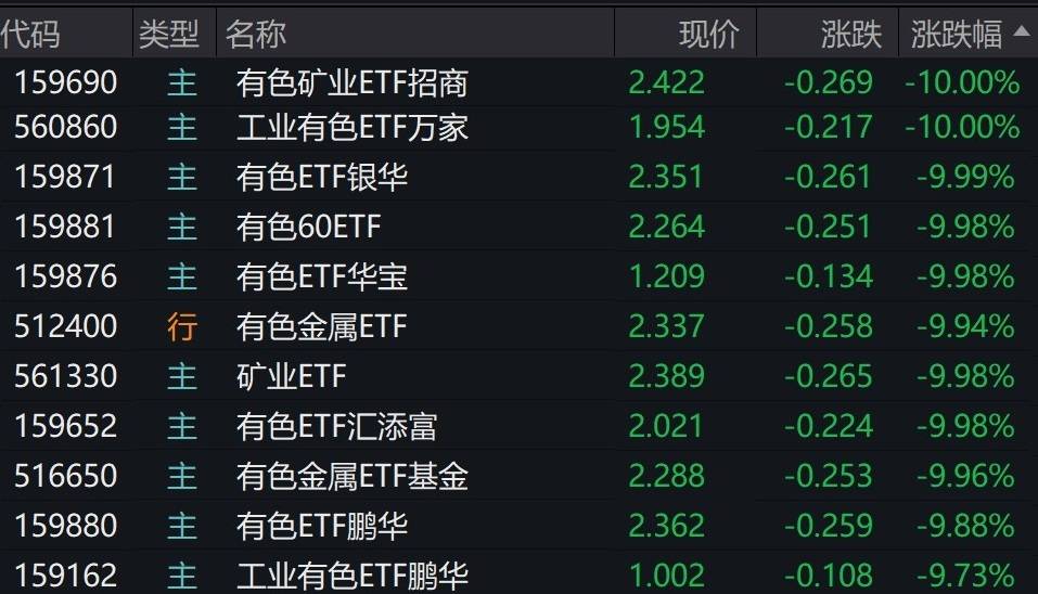 市场表现 - 有色金属概念股普遍大幅下跌,洛阳钼业、华友钴业、中国铝业、山东黄金、云铝股份、中金黄金等多只个股跌停 [1] - 受股票盘面影响,多只有色金属相关ETF出现跌停或接近跌停,例如有色矿业ETF招商(代码159690)现价2.422元,下跌0.269元,跌幅为-10.00% [1][2] - 工业有色ETF万家(代码560860)现价1.954元,下跌0.217元,跌幅为-10.00%;有色ETF银华(代码159871)现价2.351元,下跌0.261元,跌幅为-9.99% [2] - 有色金属ETF(代码512400)现价2.337元,下跌0.258元,跌幅为-9.94%;矿业ETF(代码561330)现价2.389元,下跌0.265元,跌幅为-9.98% [2] 行业观点 - 有券商观点认为,有色金属行业正迎来“超级周期”,近期黄金、白银等贵金属以及铜、铝等工业金属和钴、锂等能源金属价格均显著上涨,多个金属品种价格创下历史新高或阶段性新高 [2] - 超级周期的驱动因素之一是美联储降息周期下美元走弱趋势,推动了以美元计价的有色金属价格上涨 [2] - 驱动因素之二是供需缺口的支撑,以铜为代表的工业金属面临供给压力,包括主要矿山品位下降、边际成本抬升以及前期矿业资本开支萎缩,而需求端则受到人工智能、新能源、数据中心等基础设施建设的带动 [2] - 驱动因素之三是国内“反内卷”政策发力,推动过剩产能优化,有利于促进供需平衡 [2]