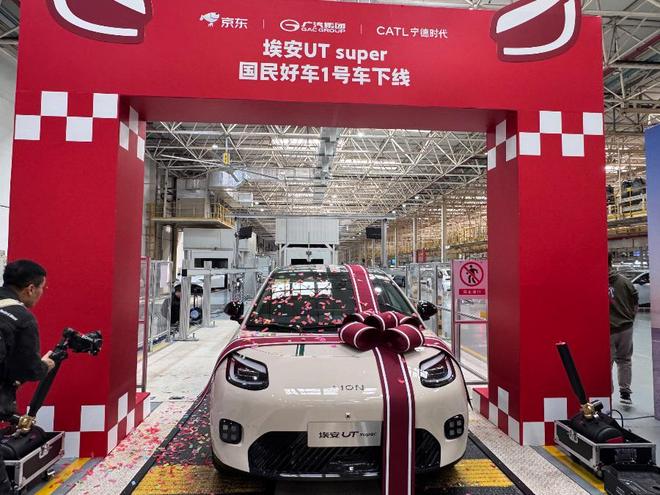 记者丨孔海丽 编辑丨骆一帆 视频编辑丨杨浩凯 11月5日上午,由京东、广汽集团、宁德时代联合推出的"国民好车"——埃安UT super 1号车 正式迎来下线。 21世纪经济报道记者现场了解到,这款车搭载宁德时代巧克力电池,续航500公里,电池可充 可换,支持99秒极速换电。 外观包含两款颜色,莫奈紫和香榭米,内饰有米色黑色两种。车身长度,基于A级车平台打造 出2750mm的B级轴距,内部空间宽敞。 该车配备同级独有的倒车哨兵与540度全景影像,提升驾驶稳定性与安全性。 在补能模式方面,宁德时代提供"巧克力换电生态"。当天,宁德时代第777座巧克力换电站在 长沙正式上线,今年将在全国45个城市建成1000座换电站,2026年将在近120个城市累计建成 超2500座换电站,远期3万座。 在售后环节,京东超3000家京东养车门店及超4万家合作门店组成的线下服务网络。为用户提 供贯穿选、买、用、养全周期的"一条龙"式服务。 目前,价格仍未公布,市场人士预计10万 元以下。 10月22日,京东001号"国民好车"在京东拍卖频道开拍,吸引了近30万人围观。经过4小时 23000多次的竞价,最终一次出价超7800万元。 截 ...