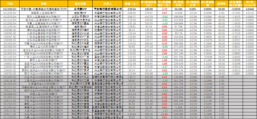 市场表现 - 本期信用债表现偏强,信用利差以收窄为主,普通信用债表现优于银行二永债[1] - 普通信用债收益率全面下行,长端下行幅度更大,5年期AAA、AA+、AA、AA-级中票收益率分别下降5.27、6.27、7.27、12.27个基点[1] - 银行二永债收益率以小幅上行为主,仅部分3年期和5年期二永债信用利差小幅走阔[1] - 7年期AAA级中票、城投债、二级资本债、永续债的信用利差分别收窄9.35、9.94、5.14、5.13个基点[1] - 本周产业债换手率小幅提升,城投债和二永债换手率出现下降[1] 市场环境与政策展望 - 债市10月至11月可能进入阶段顺风期,但公募赎回费新规尚未落地,市场博弈气氛较浓[1] - 四季度仍有5000亿元政策性金融工具和5000亿元政府债结存限额,进一步出台刺激政策的概率不大[1] - 央行在四季度降息或重启国债买入操作的概率均不高[1] - 四季度潜在的最大利空是公募基金赎回费新规,新规未落地则利空尚未完全出尽[1] - 金融体系仍然缺乏长期资金,同业存单利率处于1.65%至1.70%区间[1] 信用债需求与资金面 - 流动性宽松状态下,中短端信用债确定性较高[1] - 信用债需求端增量资金可能减少,理财和场外基金负债端面临压力,对信用债的需求支撑不足[1] - 随着第二批科创债ETF落地,信用债ETF扩容增速可能放缓,来自信用债ETF的增量资金可能减少[1] - 2026年初保险将全面实施I9新会计准则,可能导致保险对二永债的配置力量减弱,政策对银行永续债的负面影响可能大于二级资本债[1] 投资策略 - 建议对信用债继续控制久期,中短端下沉和套息加杠杆的策略占优[2] - 套息空间仍处于今年以来的相对高位,但10月以来中短端信用利差空间明显压缩,二级市场偏强行情难以延续[2] - 短期内可更多关注3年左右信用债一级市场的参与机会[2] - 平安公司债ETF(511030)规模逆势增长1.02亿元,产品定位短久期(1.94年),静态收益率当前为1.95%,近1周平均贴水仅2个基点,今年以来回撤为-0.50%[2] - 今年债市调整以来平安公司债ETF(511030)回撤控制排名第一,近1周平均贴水为-0.03%,本轮调整回撤为-0.5018%[2]