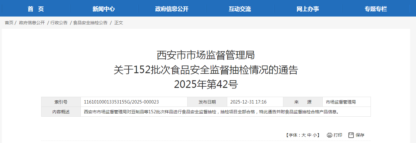 西安市市场监督管理局关于152批次食品安全监督抽检情况的通告(2025年第42号)