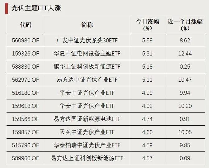 01 11月5日,A股三大股指午后走强,光伏板块爆发。多只光伏、新能源ETF大涨,广发中证光伏龙头 30ETF涨5.59%,位列A股ETF涨幅榜第一。 02 踊跃加仓行业主题ETF 光伏、新能源ETF大涨 11月5日,上证指数上涨0.23%,深证成指上涨0.37%,创业板指上涨1.03%。电网设备、海南自贸区概 念领涨,光伏设备板块涨幅居前。 A股ETF中,广发中证光伏龙头30ETF(560980)收涨5.59%,涨幅位列第一。部分科创新能源ETF、电 网设备ETF涨超5%,多只光伏产业ETF涨超4%。 从资金流向来看,11月4日,近期跌幅较大的港股创新药ETF、恒生科技ETF、半导体ETF等被加仓。 | 光伏主题ETF大涨 | | | | | --- | --- | --- | --- | | 代码 | 简称 | 今日涨幅 (%) | 近一个月涨幅 (%) | | 560980.OF | 广发中证光伏龙头30ETF | 5.59 | 8.62 | | 159326.OF | 华夏中证电网设备主题ETF | 5.31 | 12.44 | | 588830.OF | 鹏华上证科创板新能源ETF | 5.18 | ...