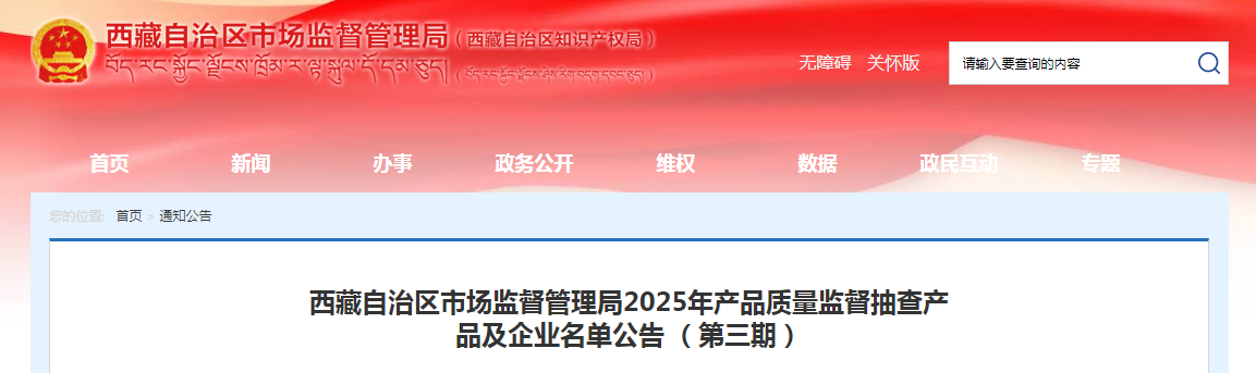 西藏自治区市场监督管理局公布2025年产品质量监督抽查产品及企业名单(第三期)