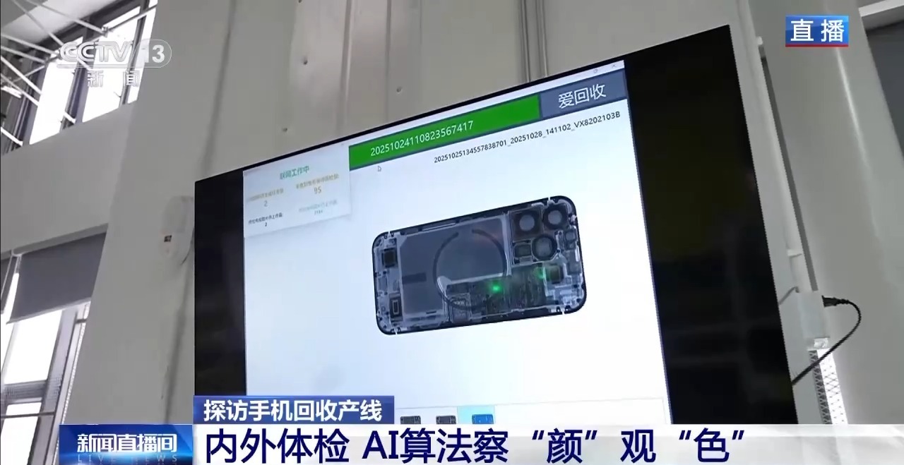 工业和信息化部发布的数据显示,今年前8个月,我国手机产量达9.61亿台,其中智能手机产量7.58亿 台,同比增长1%。在产量稳步走高的同时,废旧手机的数量也同步攀升。我们的旧手机究竟去向何 方?淘汰的旧机如何流入二手市场?所谓的"九成新""八成新"又该如何精准定级?这些疑问的答案,都 藏在标准化、智能化的处理流程里。 在东莞一家手机回收企业的自动化运营中心,从全国各地赶来的废旧手机即将沿着百米长的自动化产 线,开启一场"重生考核"。每台刚入库的旧手机都会贴上专属的二维码,相当于办了张身份证,之后的 每道工序、每个数据都实时记录,全程可查。 顺着流水线往前看,手机就会走进X光检测区做"全身透视"。不拆手机,就能看到内部结构影像。主板 有没有被修过、零件是不是原厂配置,全都能看得明明白白,整个过程仅7秒就能完成。 过了"内科"检查,就到了外观门诊了。每个拍照盒子,都搭配了工业相机和定制光源,将对手机进行 360°拍摄,连续拍摄的22张图片上传到云端,通过企业自研的外观质检大模型,边框的掉漆程度、外壳 的磕碰程度都能精准识别,进而完成成色定级。工作人员告诉记者,拍摄精度能达到24微米,质检准确 率达99.5%以上。 ...