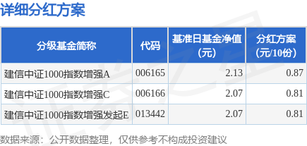 证券之星消息,10月20日发布《建信中证1000指数增强型发起式证券投资基金分红公告》。本次分红为 本基金2025年度的第一次分红。公告显示,本次分红的收益分配基准日为9月9日,详细分红方案如下: 本次分红对象为权益登记日登记在册的本基金全体份额持有人。,权益登记日为10月20日,现金红利发 放日为10月21日。选择红利再投资方式的投资者其红利再投资的份额将于2025年10月21日直接计入其基 金账户,2025年10月22日起可以查询。根据财政部、国家税务总局的相关规定,基金向投资者分配的基 金收益,暂免征收所得税。本基金本次分红免收分红手续费;选择红利再投资方式的投资者其红利所转 换的基金份额免收申购费用。 以上内容为证券之星据公开信息整理,由AI算法生成(网信算备310104345710301240019号),不构成 投资建议。 | 分级基金筒称 | 代码 | ■准日基金净值 | | 分红方案 | | | --- | --- | --- | --- | --- | --- | | | | (元) | | (元/10分) | | | 建信中证1000指数增强A | 006165 | | 2.13 | | 0 ...