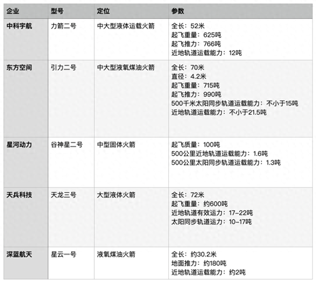 行业概览 - 2025年中国商业航天快速发展,全年完成发射50次,占全国宇航发射总数的54% [1] - 2025年商业运载火箭发射次数为25次 [1] - 2026年,国内多家商业火箭公司的新型号火箭迎来首飞,进入密集试验阶段 [1][2] 中科宇航 (力箭二号) - 公司旗下力箭二号为中大型液体运载火箭,计划于2026年首飞,首飞将发射轻舟货运飞船初样试飞船 [1][3] - 火箭全长52米,起飞重量625吨,起飞推力766吨,近地轨道运载能力达12吨 [2][3] - 在绍兴柯桥区布局建设的力箭二号液体火箭生产基地预计2026年1月底试生产,3月底投产,达产后可实现年产12枚火箭 [1][3][4] - 公司在东风商业航天创新试验区建设了力箭二号专有发射工位,以保障发射需求 [4] 东方空间 (引力二号) - 公司旗下引力二号为中大型液氧煤油火箭,高70米,直径4.2米,起飞重量715吨,起飞推力990吨 [2][5] - 火箭500千米太阳同步轨道运载能力不小于15吨,近地轨道运载能力不小于21.5吨 [2][5] - 火箭一子级计划重复使用次数不少于30次 [5] - 在山东泰安建设的液体运载火箭生产制造基地项目建成后可年产20发引力二号火箭 [5] 星河动力 (谷神星二号 / 智神星二号) - 公司旗下谷神星二号为中型固体运载火箭,起飞质量100吨,500公里近地轨道运载能力1.6吨,500公里太阳同步轨道运载能力1.3吨 [2][6] - 该火箭兼顾海陆发射,主要面向中小型星座组网和补网市场,通过技术创新与系统优化降低发射成本,单价与200吨级中型液体火箭相当 [6] - 该型火箭于2026年1月17日首飞试验失利,公司将查明故障原因并组织归零与复飞工作 [6] - 公司旗下智神星二号为大型模块化可重复使用液体运载火箭,基本型起飞质量约757吨,起飞推力约910吨,近地轨道运载能力20吨 [6] - 近期已成功开展智神星二号主发动机全系统热试车,为首飞奠定动力基石 [6] 天兵科技 (天龙三号) - 公司旗下大型液体火箭天龙三号首飞在即,全箭长度72米,起飞重量约600吨 [2][7] - 火箭近地轨道有效运力17-22吨,太阳同步轨道运力10-17吨,可实现一箭36颗互联网卫星组网发射 [1][2][7] - 火箭首飞后计划开展常态化商业发射,保障每年30次以上发射任务,逐步支撑未来每年60次以上高频发射 [1][7] - 为保障高频次发射,公司在酒泉卫星发射中心布局建设液氧煤油火箭专用发射工位,并启动第二个专用发射工位的规划建设 [7][8] 深蓝航天 (星云一号) - 公司首款可重复使用运载火箭星云一号计划于2026年春节前后首飞,挑战“首飞即回收” [1][8] - 火箭为两级构型,采用液氧煤油推进剂,具备一级可重复使用能力,全长约30.2米,地面推力约180吨,近地轨道运载能力约2吨 [2][8] - 火箭一级采用9台液氧煤油发动机并联布局,发动机地面推力约为20吨,具备单次任务3次以上起动能力 [8]