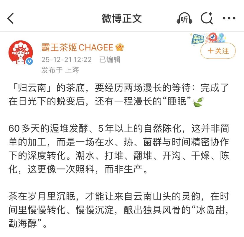 在新茶饮行业频繁上新几乎成为"标配"的当下,霸王茶姬的节奏显得并不急。 近日,霸王茶姬全国门店同步上新"归云南"系列。这是霸王茶姬时隔半年后推出的又一款全国性新品。"霸王茶姬的 新品让我想家了。"一位云南游子在社交平台发帖表示,霸王茶姬新系列"归云南"让她瞬间想到了家乡的味道。 在小红书、微博等社交平台上,不少消费者用"终于等到上新""熟普入奶茶有点惊喜"来形容这次新品。与行业常见的 水果、风味创新不同,"归云南"选择了一条更慢,也更重的路径:以冰岛熟普与勐海熟普为核心茶底,强调茶叶本身 的产地、拼配与风味结构。 对于霸王茶姬来说,"归云南"不仅是一次产品的迭代。作为霸王茶姬在三季度财报电话会后推出的首款全国新 品,"归云南"更像是品牌在八周年节点,对其"高质量增长"战略的一次落地式回应。 在新茶饮行业竞争日趋激烈的当下,狂奔8年的霸王茶姬主动选择慢下来,延续高质量发展战略,回到一杯好茶本 身,在茶底中寻找高价值的"慢变量"。 霸王茶姬修筑新内功 "归云南"含金量还在上升 在中国茶叶体系中,冰岛普洱并不算"年轻"。冰岛茶区位于云南临沧,因产量有限、风味干净细腻,在普洱茶市场中 长期被视为高端茶代表。尤其是熟普 ...