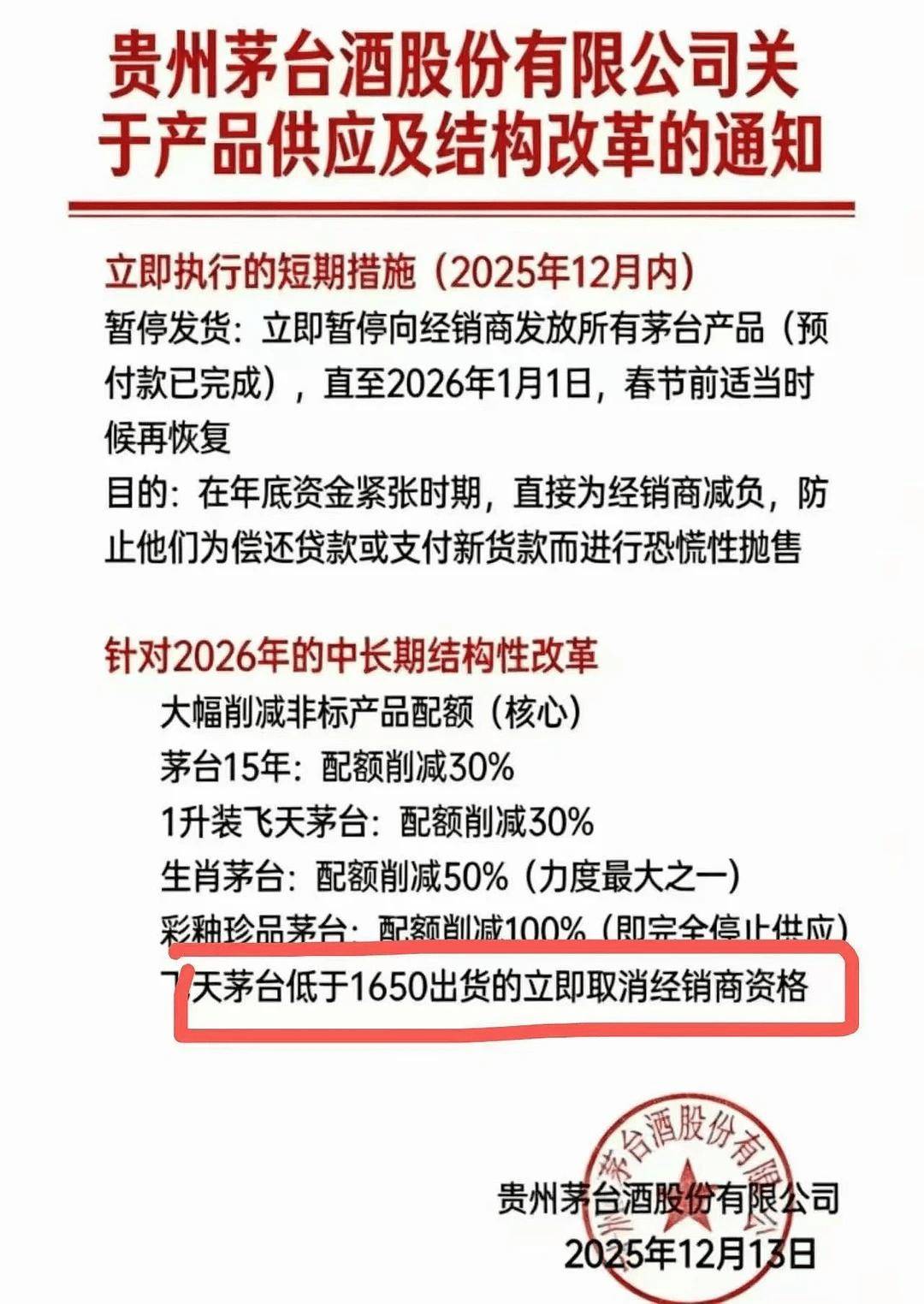 12月13日,一张署名为"贵州茅台酒股份有限公司"的内部通知截图在社交平台与酒类经销圈内流传,引发市场广泛关注。 从网传图片内容来看,该通知标题为《贵州茅台酒股份有限公司关于产品供应及结构改革的通知》,落款时间为2025年12月13日,并加盖公司印章。通知 内容主要分为"短期措施"和"中长期结构性改革"两部分。 将立即暂停向经销商发放所有茅台产品(预付款已完成),暂停时间至2026年1月1日,春节前视情况再行恢复。通知给出的目的解释为,在年底资金紧张 时期,直接为经销商减负,防止其因偿还贷款或支付新货款而出现恐慌性抛售。 在针对2026年的中长期结构性改革部分,通知提出将大幅削减非标产品配额,其中包括: 茅台15年配额削减30%;1升装飞天茅台配额削减30%;生肖茅台配额削减50%;彩釉珍品茅台配额削减100%,即完全停止供应。 其中,最受市场关注的一条是,通知明确写道:"飞天茅台低于1650元出货的,立即取消经销商资格。" 上述条款在经销商与投资者群体中引发激烈讨论,不少业内人士认为,这一表述如果属实,意味着茅台将首次以明确价格红线的方式,对渠道出货行为进 行强力约束。 通知称: 有博主表示,"这种大招不能 ...