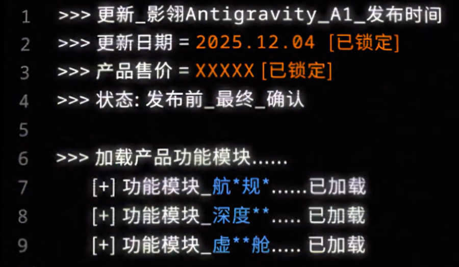 记者丨 雷若馨 编辑丨孙超逸 | 1 : | >>> 更新_影翎Antigravity_A1_发布时间 | | --- | --- | | 2 | >>>更新日期 = 2025.12.04 [已锁定] | | 3 1 | >>> 产品售价 = XXXXX [已锁定] | | | 4 >>> 状态: 发布前_最终_确认 | | ട | | | | 6 >>> 加载产品功能模块 | | 7 | [+] 功能模块_航*规* 已加载 | | 8 | [+] 功能模块_深度** 已加载 | | g | [+] 功能模块_虚**舱 已加载 | 近日, 影石创新 宣布:将于12月4日19:30举办一场高空新品发布会,推出全景无人机"影翎 Antigravity A1"。根据表述,该发布会计划在1500米高空进行,引发市场关注。 据市场消息,Antigravity A1配备两颗前向避障镜头及上下两颗全景鱼眼镜头,并搭载影石 Insta360的全景拼接技术,整机重量为249克。 除1500米高空,影石创新还计划"登月"。 11月26日,在浙江大学航空航天学院举办的"探月微型探索机器人研制项目"捐赠仪式暨样机发 布会上,影石创新 ...