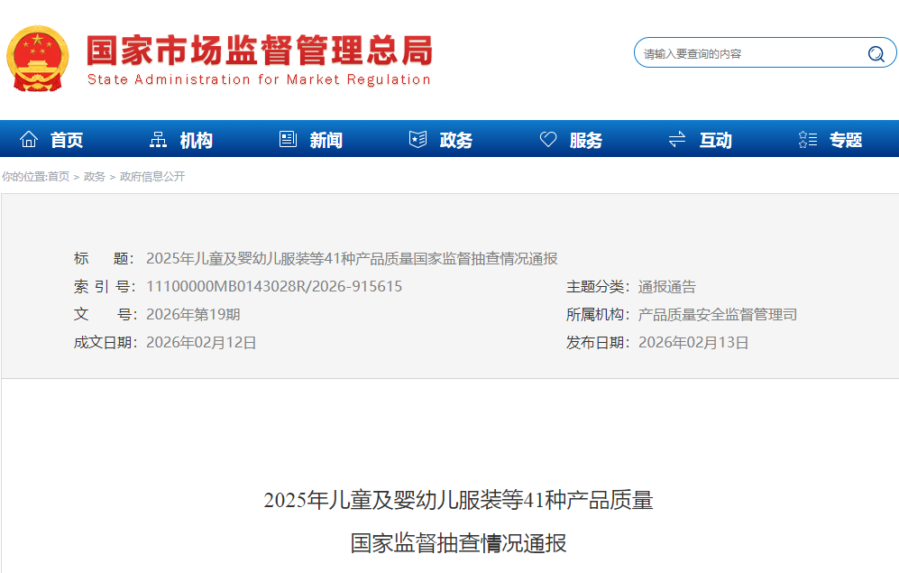 2025年儿童及婴幼儿服装等41种产品质量国家监督抽查情况通报