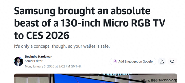 CES 2026| 三星展示130英寸Micro RGB电视:AI增强画质,支持对话搜索