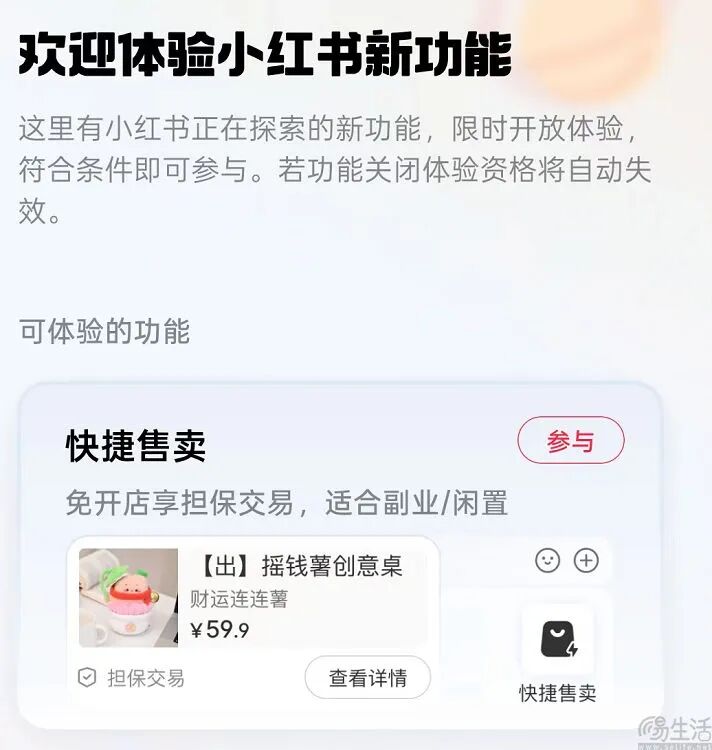小红书正在向闲鱼下战书。近日小红书方面开始测试"快捷售卖"功能,以便用户搞副业、出闲置。 据了解,凡是完成实名认证,无功能违规记录,且近180天不间断访问的小红书用户,在将App更新至 最新版本后,通过"设置-新功能体验"路径,即可进入相关体验资格的申请页面。 此前的闲鱼就已经证明,兴趣消费是交易规模的催化剂。例如《2025闲鱼潮玩消费洞察报告》就显示, 2025年潮玩交易迎来爆发式增长,第二季度该平台订单量同比提升330.2%、交易额增长309.7%。 从这个角度来看,小红书如今推出"快捷售卖"功能、降低用户出售闲置门槛,可谓是对于用户需求的一 次回应。毕竟与其白白为其他平台做嫁衣,不如将交易尽可能地留在自家平台里。 另一方面,众所周知近年来小红书一直在试图发展自己的电商业务。就在近日,为了强化用户感知,小 红书又一次在主站为电商业务开设一级流量入口,并面向买手开放橱窗权限。 而且对于用户而言,网购是消费,出闲置则是回本,虽然同样是交易,但后者显然更容易打动用户。基 于此,通过布局二手交易业务,小红书也就有望进一步聚拢、转化站内交易流量,以培育用户的交易心 智,进而加速电商业务的闭环, 退一步来说,当下淘宝 ...