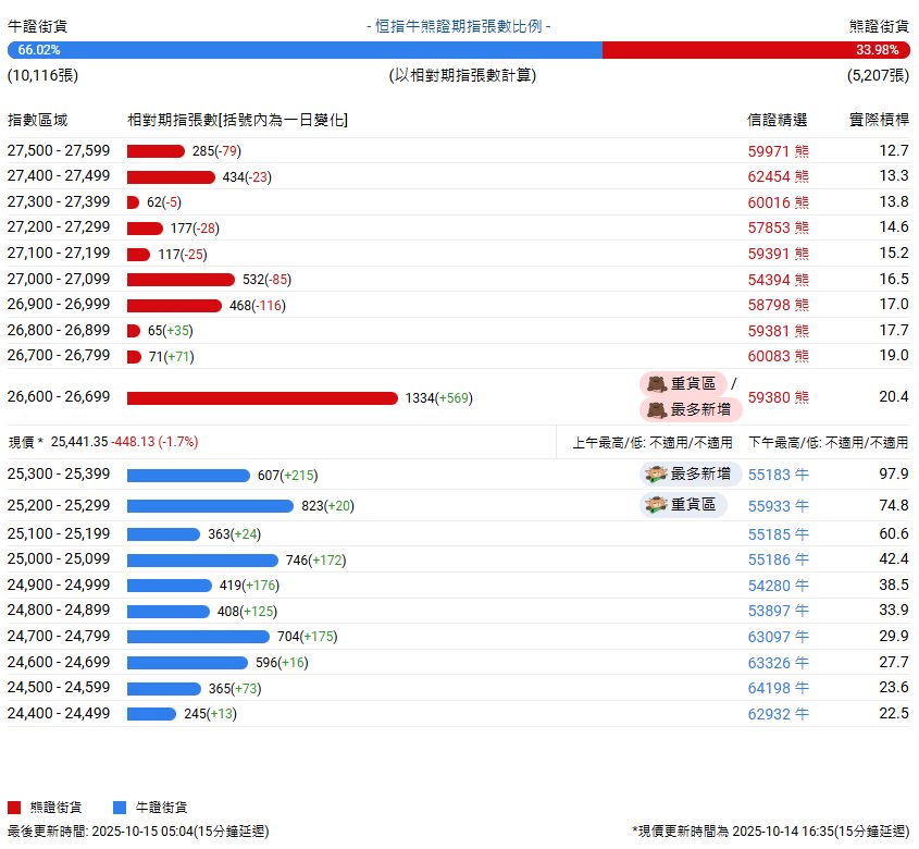 | 牛證街貨 | | - 恒指牛熊證期指張數比例- | | | 熊證街貨 | | --- | --- | --- | --- | --- | --- | | 63.86% | | | | | 36.14% | | (11,761張) | | (以相對期指張數計算) | | | (6,6555長) | | 指數區域 | 相對期指張數[括號內為一日變化] | | | 信證精選 | 雷際槓桿 | | 27,400 - 27,499 | 486(-84) | | | 62454 龍 | 25.6 | | 27,300 - 27,399 | 437(-67) | | | 60464 # | 28.6 | | 27,200 - 27,299 | | 1034(-182) | 重量 | 62451 能 | 31.0 | | 27.100 - 27.199 | | 873(-112) | | 59967 能 | 36.1 | | 27,000 - 27,099 | 263(-60) | | | 60584 能 | 36.6 | | 26,900 - 26,999 | 155(+7) | | | 61020 龍 | 将上市 | ...