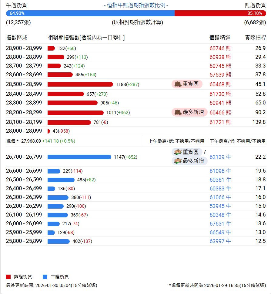 恒指牛熊街货比(65:35)︱1月30日