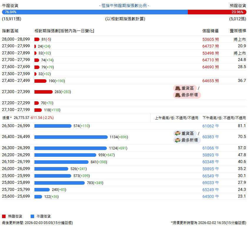恒指牛熊街货比(76:24)︱2月3日