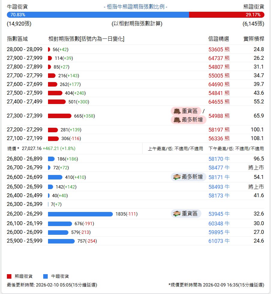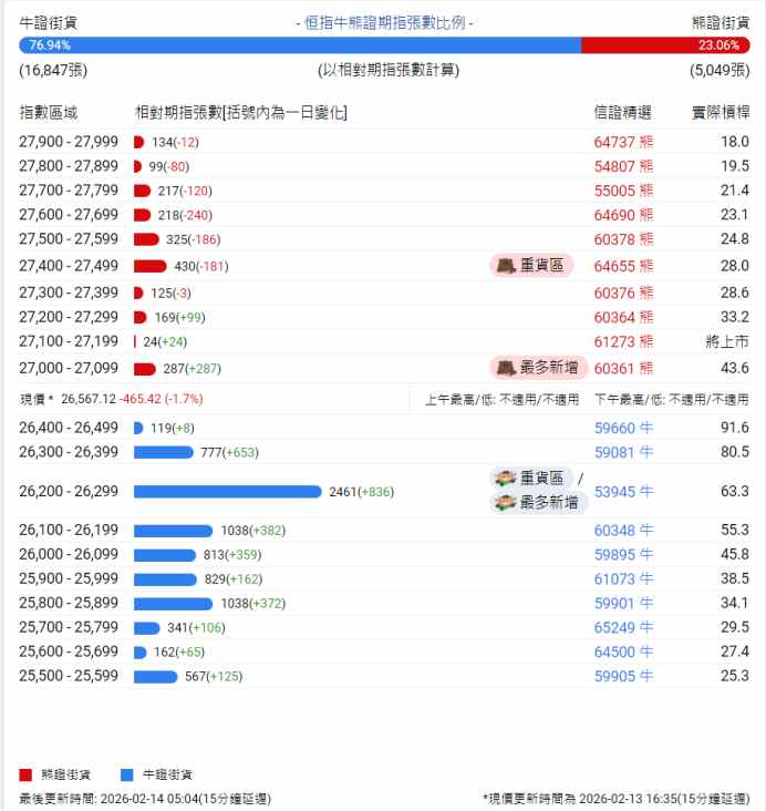 恒生指数牛熊证街货分布概况 - 截至2月13日,恒生指数牛熊证街货比例为73:27,显示市场看多情绪占据主导 [1] - 牛证总街货相对期指张数为16,137张,熊证总街货相对期指张数为5,970张 [2] 熊证街货分布与变化 - 熊证街货重货区位于28,100-28,199点区间,该区间最新熊证数量为686张,较上一交易日减少157张 [1] - 熊证街货最多新增区间为27,300-27,399点,该区间最新熊证数量为128张,较上一交易日增加79张 [1] - 在27,600-27,699点区间,熊证数量为457张,较上一交易日大幅减少226张 [2] - 在27,800-27,899点区间,熊证数量为180张,较上一交易日减少126张 [2] 牛证街货分布与变化 - 牛证街货重货区位于26,200-26,299点区间,该区间最新牛证数量为1,625张,较上一交易日增加144张 [1] - 牛证街货最多新增区间为26,600-26,699点,该区间最新牛证数量为745张,较上一交易日大幅增加376张 [1] - 在26,800-26,899点区间,牛证数量为1,067张,较上一交易日增加99张 [2] - 在26,500-26,599点区间,牛证数量为374张,较上一交易日增加165张 [2] - 在26,300-26,399点区间,牛证数量为124张,较上一交易日增加108张 [2] 市场现价与交易区间 - 恒生指数现价为27,032.54点,当日下跌233.84点,跌幅为0.9% [2]