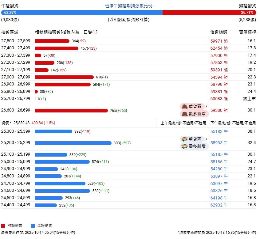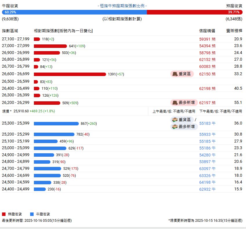 智通财经APP获悉,截至10月16日,恒指最新的牛熊街货比例为60:40。 牛证街货重货区和最多新增都在25300-25399区间,该区间最新牛证数量为867张,较上一交易日增加260张。 | 牛證街貨 | | - 恒指牛熊證期指張數比例- | | | 能證街貨 | | --- | --- | --- | --- | --- | --- | | 60.29% | | | | | 39.71% | | (9,638張) | | (以相對期指張數計算) | | | (6,348張) | | 指數區域 | 相對期指張數[括號內為一日變化] | | | 信證精選 | 實際槓桿 | | 27,100 - 27,199 | 118(+2) | | | 59391 能 | 20.9 | | 27,000 - 27,099 | 641(+109) | | | 54394 能 | 23.6 | | 26,900 - 26,999 | 503(+36) | | | 58798 能 | 24.4 | | 26,800 - 26,899 | 121(+56) | | | 62152 能 | 27.0 | | 26,700 - 26, ...
