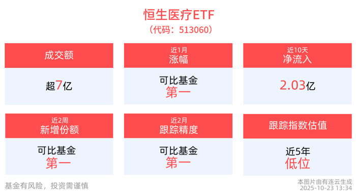 截至2025年10月23日 13:34,恒生医疗保健指数下跌2.71%。成分股方面涨跌互现,巨子生物领涨 6.58%,石四药集团上涨0.66%,讯飞医疗科技上涨0.34%;药捷安康-B领跌7.86%,佰泽医疗下跌 6.95%,科伦博泰生物-B下跌6.31%。恒生医疗ETF(513060)下跌2.41%,最新报价0.65元。拉长时间看, 截至2025年10月22日,恒生医疗ETF近3月累计上涨3.42%,涨幅排名可比基金1/3。 流动性方面,恒生医疗ETF盘中换手11.25%,成交7.63亿元,市场交投活跃。拉长时间看,截至10月22 日,恒生医疗ETF近1年日均成交17.15亿元,排名可比基金第一。 截至2025年10月23日 13:34,恒生港股通创新药精选指数下跌3.70%。成分股方面,荣昌生物领跌 11.58%,药捷安康-B下跌7.86%,科伦博泰生物-B下跌6.31%,再鼎医药下跌5.78%,乐普生物-B下跌 5.39%。港股创新药精选ETF(520690)下跌3.26%,最新报价0.89元。 流动性方面,港股创新药精选ETF盘中换手21.44%,成交9851.77万元,市场交投活跃。拉长时间看, 截 ...