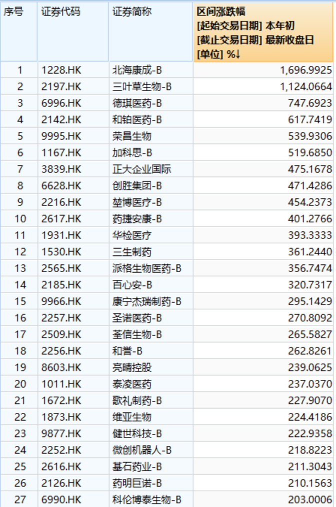 10月14日,香港交易所宣布,计划在今年11月28日推出恒生生物科技指数期货,进一步优化其不断拓展的衍生产品生 态圈。 2025年上半年,共10家医疗保健公司在港上市,共融资21亿美元,平均首日升幅达30.4%,使香港成为全球医疗保健 新股融资额最高的市场。 香港医疗保健行业发行人的再融资活动也同样活跃,2025年上半年共完成27宗再融资,融资共计39亿美元,已超越 2022、2023、2024全年的再融资总额。 在这一背景下,港股市场今年的医药大牛股频出,尤其是18A公司表现亮眼。数据显示,在260家Wind医疗保健公司 中,有27家公司今年以来的涨幅超过200%,其中绝大部分是18A公司。 | 序号 | 证券代码 | 让券简称 | 区间涨跌幅 | | | --- | --- | --- | --- | --- | | | | | [起始交易日期] 本年初 [截止交易日期] 最新收盘日 | | | | | | [单位] %↓ | | | 1 | 1228.HK | 北海康成-B | | 1,696.9925 | | 2 | 2197.HK | 三叶草生物-B | | 1,124.0664 | | 3 | 6 ...