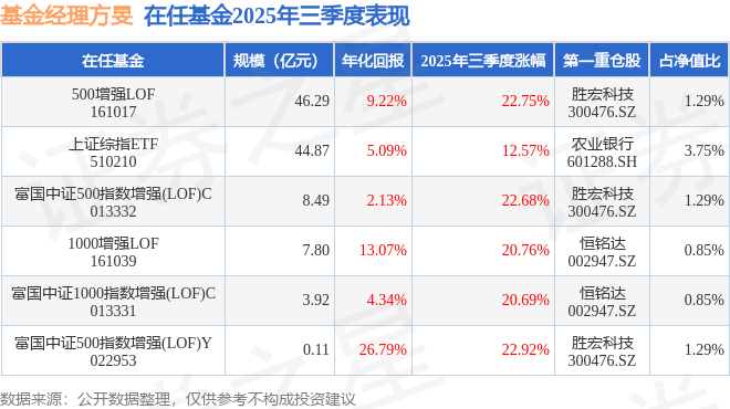 方旻2025年三季度表现,富国中证500指数增强(LOF)Y基金季度涨幅22.92%
