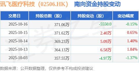 证券之星消息,10月16日南向资金减持5550.0股讯飞医疗科技(02506.HK)。近5个交易日中,获南向 资金增持的有3天,累计净增持8.54万股。近20个交易日中,获南向资金增持的有16天,累计净增持 25.34万股。截至目前,南向资金持有讯飞医疗科技(02506.HK)371.06万股,占公司已发行普通股的 4.79%。 讯飞医疗科技股份有限公司是一家主要从事提供人工智能赋能的医疗解决方案的中国公司。基层医疗服 务业务线由智医助理及慢病管理组成。医院服务业务线包括智慧医院解决方案和诊疗助理。患者服务业 务线包括智慧医院患者服务与诊后管理(包括讯飞晓医App及小程序)、影像云平台以及医疗器械。区 域管理平台解决方案业务线包括智慧卫生解决方案和智慧医保。该公司主要在国内市场开展业务。 以上内容为证券之星据公开信息整理,由AI算法生成(网信算备310104345710301240019号),不构成 投资建议。 | 交易日 | 持股总数(股) | 持股变动(股) | 变动幅度 | | --- | --- | --- | --- | | 2025-10-16 | 371.06万 | -5550.0 | -0.1 ...
