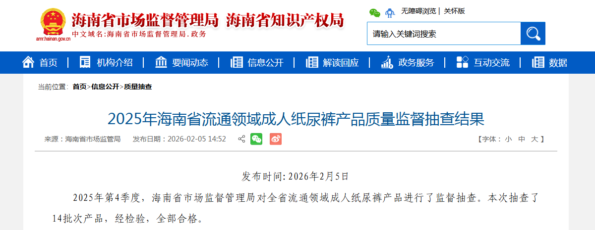 2025年海南省流通领域成人纸尿裤产品质量监督抽查结果公布