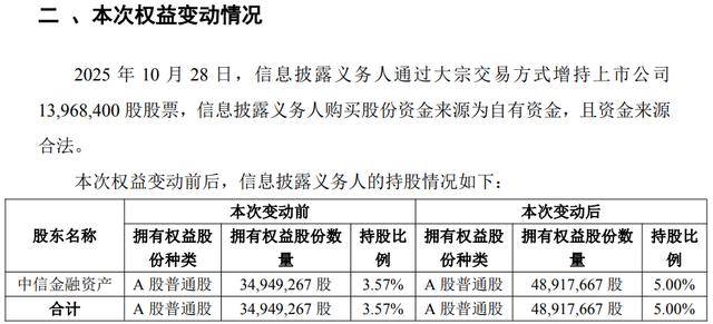 举牌事件概述 - 中信金融资产于10月28日通过大宗交易增持杭氧股份1396.84万股,占公司总股本1.43% [1][2] - 增持后,中信金融资产对杭氧股份的持股比例从3.57%提升至5%,构成举牌 [1][2] - 本次增持交易均价为26.06元/股,耗资约3.64亿元 [1][2] - 举牌消息披露后,10月30日公司股价涨停,报收29.52元/股,涨幅9.99%,触及年内最高,2025年以来公司股价累计上涨35.4% [1][2] 举牌方意图与未来计划 - 中信金融资产举牌是基于对杭氧股份发展前景的看好及其价值的认可,旨在提升对上市公司的影响力并支持其做强做优 [3] - 举牌方拟按照市场化、法治化原则拓展业务合作空间,实现互利共赢 [3] - 中信金融资产在未来12个月内不排除进一步增加其在杭氧股份中拥有的权益的可能 [4] 公司近期财务表现 - 2025年三季度公司实现营业收入41.01亿元,同比增长13.12%,净利润和扣非净利润分别为2.78亿元和2.67亿元,同比增长16.79%和21.6%,单季度业绩及增速均创近两年来最高 [1][5] - 2025年前三季度公司实现营业收入114.28亿元,同比增长10.39%,净利润7.57亿元,同比增长12.14%,扣非净利润7.28亿元,同比增长16.27%,结束了2022年至2024年连续三年扣非净利润下行趋势 [5] - 2025年前三季度公司经营活动产生的现金流量净额为19.47亿元,同比增长140.03% [6] 公司业务模式与市场拓展 - 公司业务覆盖空分设备研发制造、气体生产运营、工程总承包等全链条,形成“设备+气体+服务”的协同模式 [7] - 公司积极拓展全球市场,成功签订1套海外2.2万空分项目,实现了非洲地区大型空分设备的零突破 [7] - 2025年上半年公司在境外市场实现营业收入2.95亿元,同比增长78.89% [7] 行业地位与研发投入 - 公司是中国空分装备制造业的龙头,通过自主创新研发,在大型、超大型空分设备的研发制造上达到世界先进水平,打破了国外长期技术垄断 [1][7] - 2025年前三季度公司的研发费用为2.98亿元,占营业收入的2.6% [8]