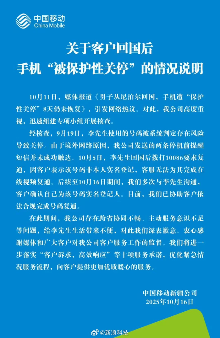 【#中国移动就保护性关停事件致歉#】10月16日,中国移动新疆公司发布关于客户回国后手机"被保护 性关停"的情况说明:经核查,9月19日,李先生使用的号码被系统判定存在风险导致关停。由于境外网 络原因,公司发送的两条停机前提醒短信并未成功触达。10月5日,李先生回国后拨打10086要求复通, 因客户表示该号码非本人实名登记,客服无法为其完成在线视频复通。后续至10月16日期间,公司多次 与李先生沟通,客户确认自己为该号码实名登记人。目前,公司已协助客户依法合规完成号码复通。 (智通财经) 中国移动新疆公司 2025年10月16日 63 @新浪科技 ...