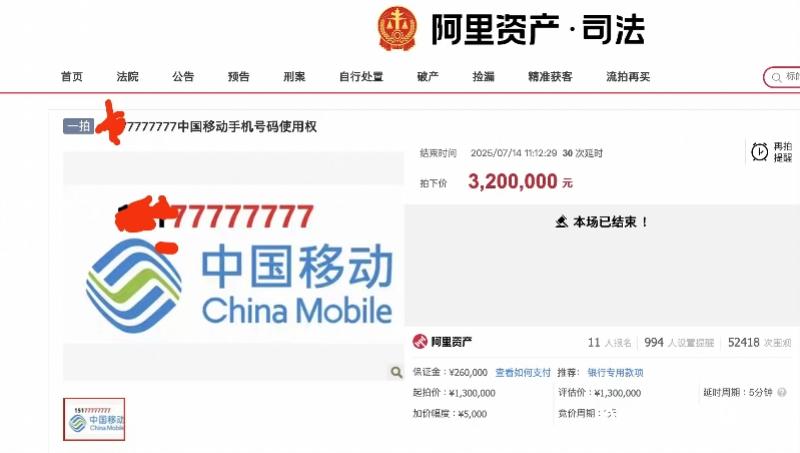 近日,南都湾财社记者从阿里拍卖平台获悉,日前尾号为"77777777"的手机靓号以130万元的起拍价开拍,经过46 轮激烈竞拍,最终以320万元的价格成交。 据阿里拍卖平台显示,该尾号为"77777777"的手机靓号归属广西移动南宁分公司,此前法院已查封该手机号码。 经调查,截至2025年6月7日,该号码无欠费,余额约30.6元。根据号码分级规则,该号码属于高档吉祥号码12 级,属于A类吉祥号码。 值得注意的是,尽管该类靓号手机号码以高价拍出,但竞拍者所获得的仅为该号码的"使用权",而非所有权。在 过户过程中产生的相关费用均需由买受人自行承担。此外,竞买人还需自行咨询确认能否办理使用权变更、变更 手续的时间以及变更后需遵守的业务规定等事宜。 南都湾财社记者获悉,该手机靓号话费消费标准设置为1500元/月,故每月至少会按1500元收取月结费用。消费年 限20年,目录价标准为预存15000元。平台提示,该号码过户的基本业务规则为:新入网满5年后方可办理过户业 务,两次过户时间间隔不得少于5年。办理过户时,新机主需持法院相关法律文书及本人有效证件原件到广西区内 沟通100营业厅办理过户手续。 (文章来源:南方都市报 ...
