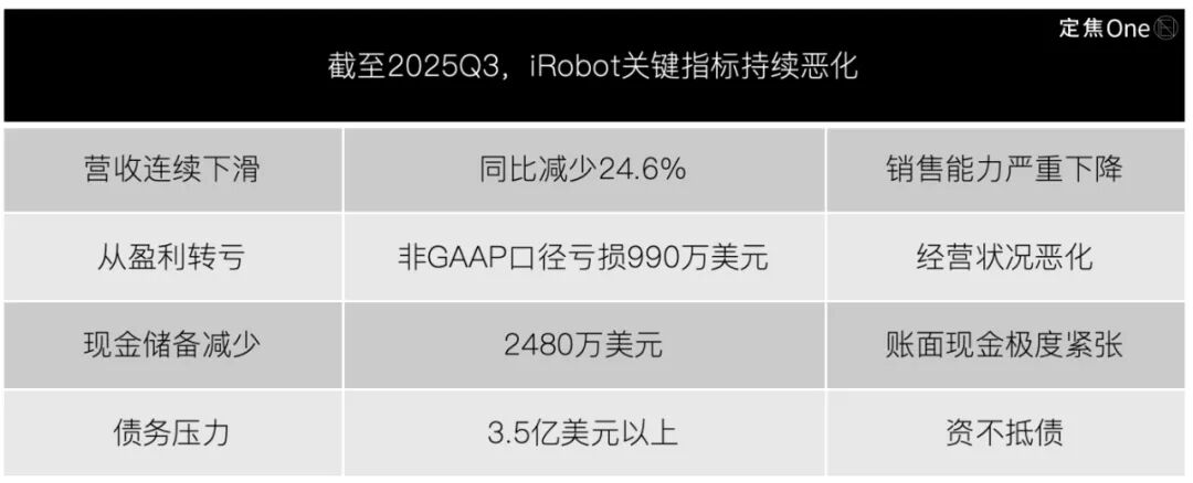 一夜之间,扫地机器人行业的开创者iRobot,被自己的中国代工厂收入囊中。 北京时间12月15日晚,美股开盘后,扫地机器人行业发生了一场"地震":iRobot股价断崖式下跌,跌幅一度超过70%,并多次触发熔断。截至美股16日收 盘,其股价跌至0.76美元,市值缩水至不足2500万美元。 这一切的导火索,是一天前(12月14日)深夜的一份公告。iRobot正式申请了Chapter 11破产保护(一种允许企业在法庭保护下重组债务、继续经营的"重 整型破产"),并公告了其结局:公司将退市,被自己最大的中国代工厂——深圳杉川机器人有限公司(下称"杉川")全资收购。 简言之,杉川用它持有的超3.5亿美元债权,"换"走了iRobot的全部所有权。原股东投资血本无归。 | | 截至2025Q3, iRobot关键指标持续恶化 | 定焦One( | | --- | --- | --- | | 营收连续下滑 | 同比减少24.6% | 销售能力严重下降 | | 从盈利转亏 | 非GAAP□径亏损990万美元 | 经营状况恶化 | | 现金储备减少 | 2480万美元 | 账面现金极度紧张 | | 债务压力 | 3.5亿美元以上 ...