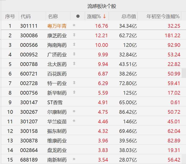 另外,阿里健康平台数据显示,近两周(11.10-11.23)流感应季药品的关注度和购买量均有明显提升。总 体而言,流感抗病毒药物购买人数呈现超500%的环比增长。其中玛巴洛沙韦表现尤为突出,购买人数 环比增长超600%,增速领先;抗病毒口服液购买人数环比50%。反映出消费者对流感的防治意识进一 步增强。 格隆汇11月25日|流感季提前到来,A股市场流感概念股活跃。其中,一品红涨13%,亨迪药业涨近 11%,特一药业、广济药业、海南海药、北大医药10CM涨停,华兰疫苗涨近10%,众生药业、粤万年 青涨超7%,南新制药涨超6%,尔康制药、鲁抗医药、英诺特、康芝药业、新华制药涨超5%。 消息面上,11月以来,全国流感活动快速上升,北京已迈入呼吸道传染病高发期。有数据显示,奥司他 韦近7天销量暴涨237%,速福达(玛巴洛沙韦)涨幅达180%。 | | | | | 流感板块个股 | | | | --- | --- | --- | --- | --- | --- | --- | | 序号 | 代码 | 名称 | | 涨幅% ↓ | 总市值 | 年初至今涨幅% | | 1 | 300723 | 品 | 1 | 13.01 ...