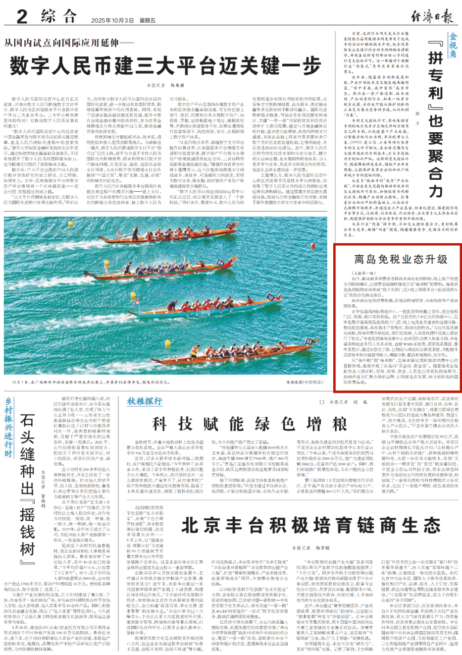 10月3日 《经济日报》头版、2版刊发文章 《离岛免税业态升级》 版面图及全文如下 左右 核心体验之一 随着海南离岛免税政策的 不断优化 "免税购物天堂" 成为海南的又一张新名片 购物不再只是旅行的点缀 而成为游客赴琼旅游的 外国游客在三亚大东海旅游区购物。图源于三亚大东海旅游区 10月1日,位于海口市的海控全球精品免税城内,前来购物的消费者络绎不绝,在海南上大学的黄宇轩也是其中一员。"这是我第N次来免税城购物,这次 趁国庆假期出游来买一些护肤类产品。"黄宇轩说,海南离岛免税政策实施后,免税店成为她的购物首选,不仅价格优惠,新推出的"即购即提"政策也很 方便。 消费者在海控全球精品免税城内参与活动。图源于海控免税 海控全球精品免税城有限公司相关负责人介绍,近年来,免税城热卖商品格局有所改变,除传统热销产品外,彩妆、3C数码等品类销售增速较快,年轻 群体逐渐成为离岛免税购物的消费主力。这些年,为持续优化购物体验,免税城推出私享SPA、酒水品鉴等特色服务,全力打造海南离岛免税高端购物体 验新标杆。 资料图:海控全球精品免税城。南海网、南国都市报记者 李昊 摄 cdf海口国际免税城里,节日气息扑面而来。今年国庆中秋 ...