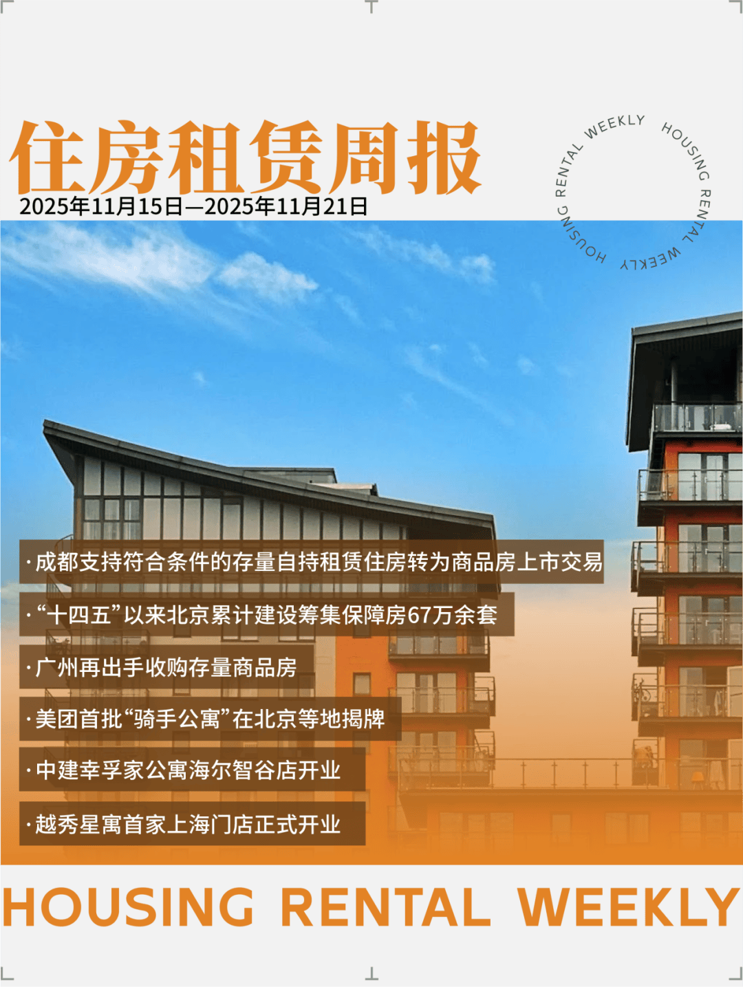 成都:符合条件的存量自持租赁住房可转为普通商品住房上市交易 11月21日,成都发布《关于印发推动存量资源优化利用政策措施的通知》,其中明确:商住混合用地及商住组合供应宗地,商业项目与住宅项目须同步建 成并投入运营;对原土地出让时明确的要求配建自持租赁住房, 满足对应条件后,允许存量自持租赁住房转为普通商品住房并上市交易。 广州:公租房轮候补贴时限从5年缩短至3年 广州市住房和城乡建设局近日发布关于调整完善公共租赁住房轮候有关工作的通知,将公租房轮候期间领取住房租赁补贴时限从5年缩短至3年,调整允许 轮候超过3年且未获配租的家庭申请补贴,通知要求每3年进行资格审核。 "十四五"以来北京累计建设筹集保障房67万余套 11月21日,首都"十四五"规划高质量收官系列主题新闻发布会"住有所居"专场披露,自"十四五"以来,北京累计建设筹集保障房67万余套,其中竣工43万 套,连续四年为大学生提供1.4万余套青年公寓,助力人才安居。 广州再出手收购存量商品房 放宽房源征集门槛 11月18日,广州安居集团发布《关于持续推进收购存量商品房用作保障性住房等房源的征集通告》称,为进一步加大收购力度,现面向社会持续公开征集 符合条件 ...