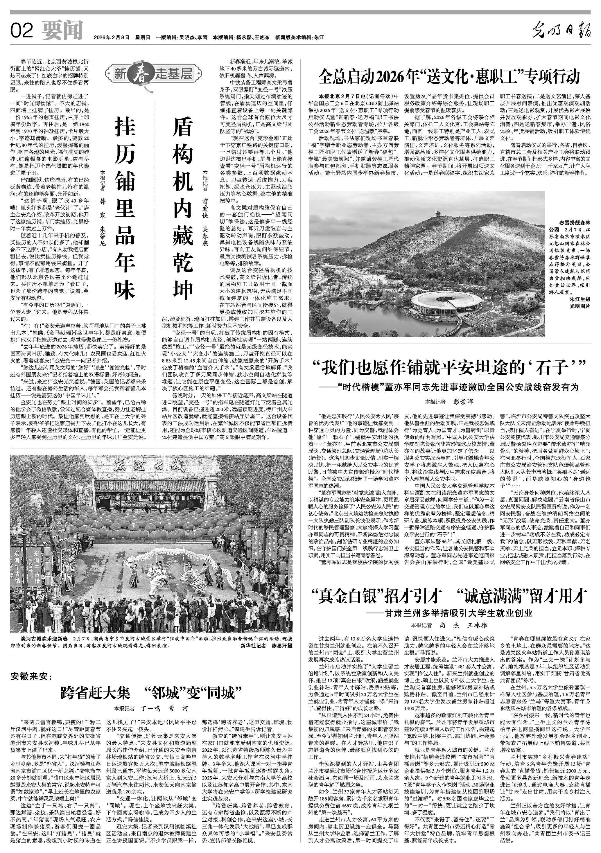 北京传统挂历店铺的经营与文化传承 - 核心观点:一家经营超过40年的北京传统挂历店铺,在数字时代通过坚守文化情怀、服务特定客群并尝试数字化转型,展现了传统业态的韧性及其承载的文化与情感价值 [1][2] - 店铺历史与藏品:店铺开业于改革开放初期,收藏并销售从1955年至20世纪80年代的各种挂历,包括1955年翻页挂历、1960-1970年代袖珍挂历以及大量80年代主题丰富的挂历,高峰期年销量超过一万件 [1] - 当前客群与销售:尽管手机普及导致客流量减少,但店铺拥有一批忠实老顾客,包括从北京各区及外地专程前来的消费者,2026年国画诗词及农民画主题挂历畅销,部分海外华人也定期委托购买以感受“中国年味儿” [2] - 适应与传承:年逾古稀的店主已学会使用微信收款并尝试直播,其正在上大学的孙子计划利用社交媒体和直播帮助传承店铺,旨在向更多年轻人传播挂历中的文化与年味 [2] 中国盾构装备技术的重大创新与应用 - 核心观点:中国自主研发的全球首台原位大尺寸可变径盾构机“变径一号”实现了技术突破,正在广州芳白城际隧道项目中成功应用,为全球城市核心区轨道交通建设提供了创新解决方案 [4][5] - 设备技术与突破:“变径一号”采用无级变径技术,刀盘开挖直径可在8.83米至12.45米之间自由伸缩,攻克了多刀梁同步伸缩、狭小空间自动化拼装等国际性难题,实现了“一站两隧、连续成型”的一体化施工,将传统工法从“开胸手术”变为“血管介入手术” [4][5] - 项目应用与效益:该设备目前正处于下穿京广铁路的关键施工期,已掘进超过200米,进度远超预期,其在繁华城区的应用预计能节省巨额征地拆迁费用,并为全球城市核心区隧道与车站一体化建造提供“中国方案” [4][5] - 工程师与维保:中铁装备工程师高文梁运用其独创的“望闻问切”维保法对设备进行精密维护,并通过手机实时监控刀盘转速、系统推力等上百项运行参数 [4] 兰州市“大学生留兰倍增计划”的人才吸引政策 - 核心观点:兰州市通过实施“大学生留兰倍增计划”,推出一系列系统性政策与人文关怀措施,旨在三年内吸引20万名大学生在兰州就业创业,构建青年发展型城市 [8][10] - 政策核心措施:计划包含13项“真金白银”政策,涵盖就业创业补贴、青年人才驿站、房票补贴等,已累计为123名大学生发放留兰房票补贴超过1400万元,并统筹建设了1481套可实现“拎包入住”的人才公寓 [8][10] - 具体服务与成效:设立37家青年人才驿站,每日提供185间免费客房,累计为千余名求职青年提供免费住宿4657晚,通过“招聘会进校园”、“直播带岗”等形式累计吸引近500家企业提供超过3万个岗位,服务青年1.2万余人次 [8][10] - 青年发展与基层参与:打造“青年大讲堂”等品牌活动,已有3.5万名大学生参与社区基层治理,1.6万名青年志愿者服务重大赛事,并通过“乡村振兴青春建功”行动培育青年先锋,开展13场“青春助农”直播带货,销售额近2000万元 [11][12]