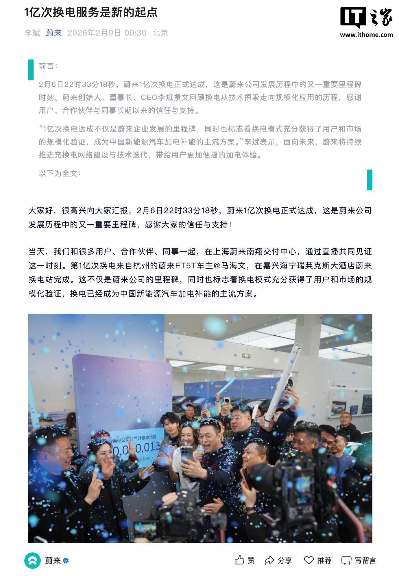 公司战略与规划 - 公司计划在2026年新建1000座换电站,并将“加电风景线”增至100条 [1] - 公司继2023年贯通G318川藏、滇藏换电路线后,2024年计划打通丝绸之路换电路线 [1] - 公司第五代换电站将于2024年开启大规模建设,firefly萤火虫用户将很快体验到换电服务 [1] 换电业务里程碑与运营数据 - 公司于2024年2月6日22时33分18秒达成累计1亿次换电,从第1次到第1亿次用时2819天(约7.7年)[6] - 公司首座换电站于2018年5月在深圳南山落成,达成1亿次换电用时不到8年,年均换电超1200万次 [6] - 公司单日换电服务量已突破10万次 [6] - 第1亿次换电由一位浙江杭州的2025款蔚来ET5T车主在浙江海宁完成 [6] 基础设施投入与行业影响 - 过去11年,公司在充换电基础设施领域累计投入超过180亿元,布局超过2100项专利 [6] - 1亿次换电标志着换电模式完成了从设想到规模化运行的验证 [6] - 换电模式的稳定、便利和长期价值得到用户高度认可,正在成为中国新能源汽车加电补能的主流方案 [6] - 换电模式的成果被归功于用户、合作伙伴与产业的共同推动 [6]