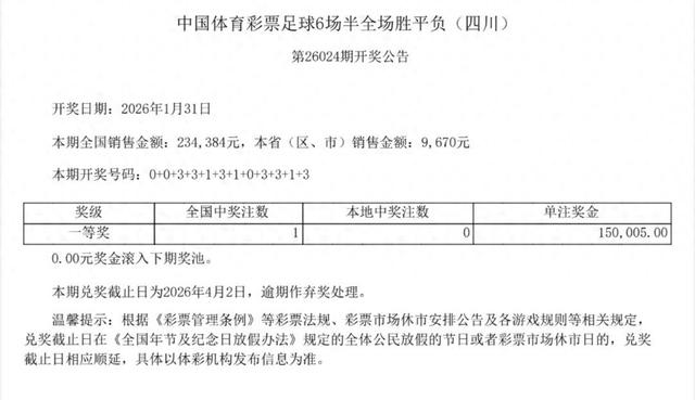 7星彩第26017期销售与开奖情况 - 全国销售额为17,990,680元 [1] - 开奖号码为802680+0,一等奖无人中出,共0注 [1] - 二等奖中出5注,每注奖金827,140元 [1] - 三等奖中出25注,每注奖金3,000元 [1] - 当期有302,078,293.28元奖金滚入下期奖池 [1] 排列3第26039期销售与开奖情况 - 全国销售额为43,767,072元 [1] - 开奖号码为852 [1] - “直选”玩法全国中奖15,840注,其中四川省中出715注,每注奖金1,040元 [1] - “组选6”玩法全国中奖56,324注,其中四川省中出1,885注,每注奖金173元 [1] - 当期有69,741,160.59元奖金滚入下期奖池 [1] 排列5第26039期销售与开奖情况 - 全国销售额为24,448,110元 [1] - 开奖号码为85288 [1] - 一等奖中出172注,每注奖金100,000元 [1] - 当期有349,026,430.26元奖金滚入下期奖池 [1] 足球6场半全场胜平负第26031期销售与开奖情况 - 全国销售额为894,770元 [1] - 开奖号码为330100000011 [1] - 全国中奖37注,其中四川省中出3注 [1] 足球4场进球第26031期销售与开奖情况 - 全国销售额为3,460,374元 [1] - 开奖号码为30131211 [1] - 全国中奖636注,其中四川省中出26注 [1] 兑奖期限 - 当期开奖彩票的兑奖截止日期为2026年4月10日,逾期未兑视为弃奖 [1]